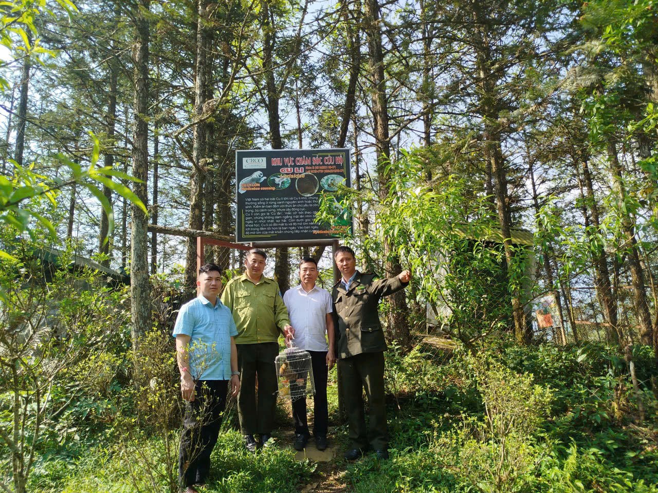 Đại diện UBND xã Cảm Nhân, Kiểm lâm và Trung tâm Du lịch và Bảo tồn Sinh vật Hoàng Liên tại buổi bàn giao cá thể Cu li nhỏ.